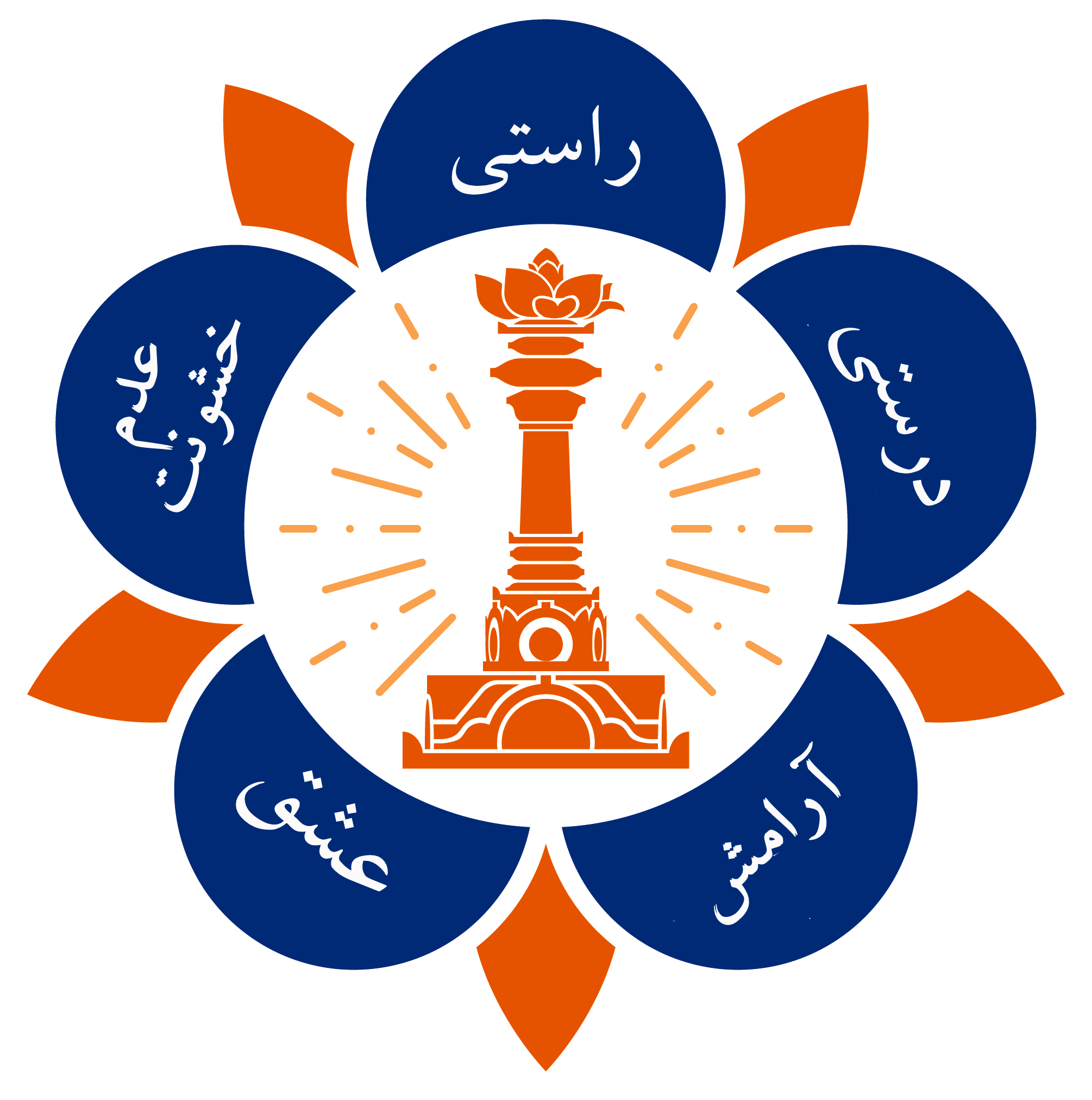Also pictured in the logo is a tall pillar, called the sarva dharma stupa with a lotus flower on it. The sarva dharma stupa represents all religions and faiths of the world.